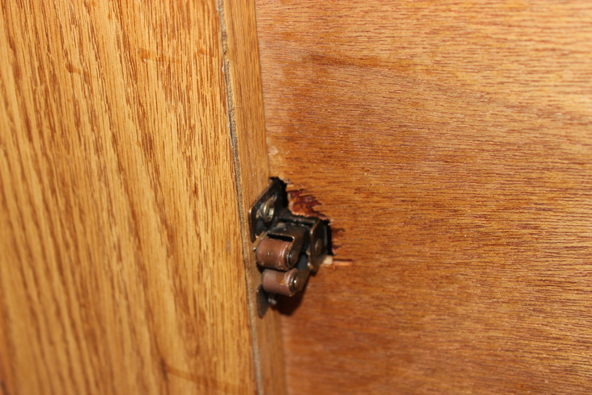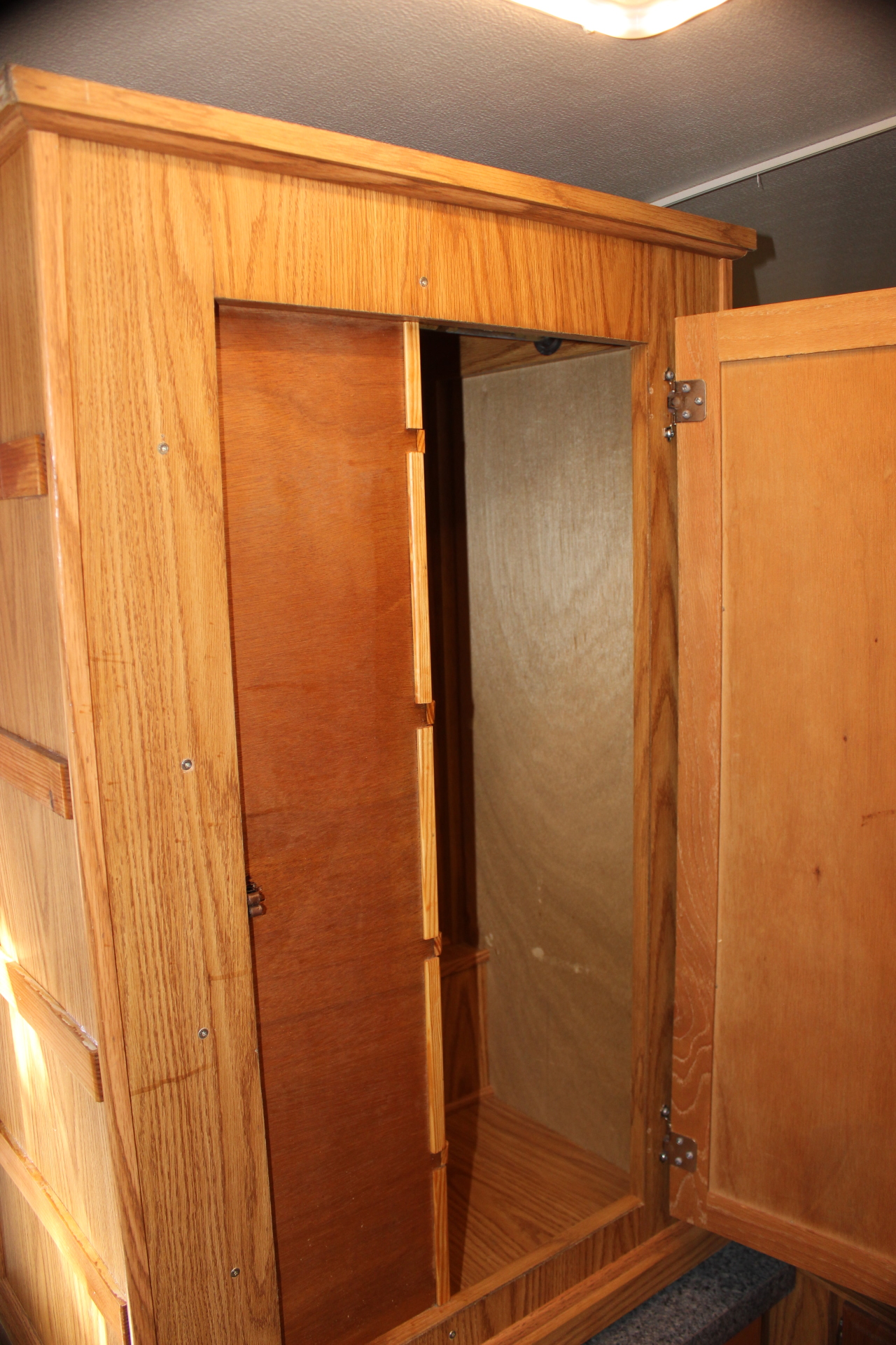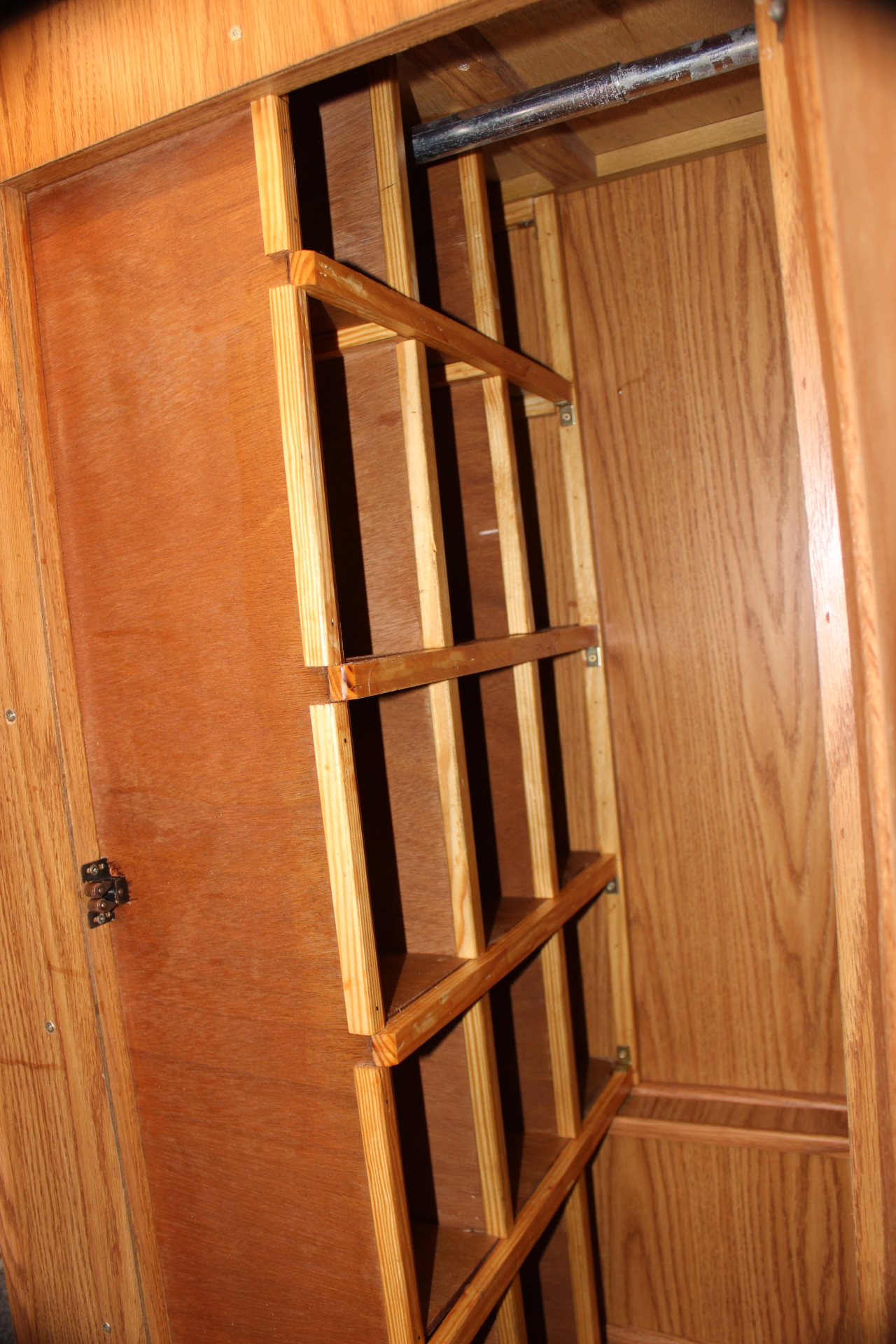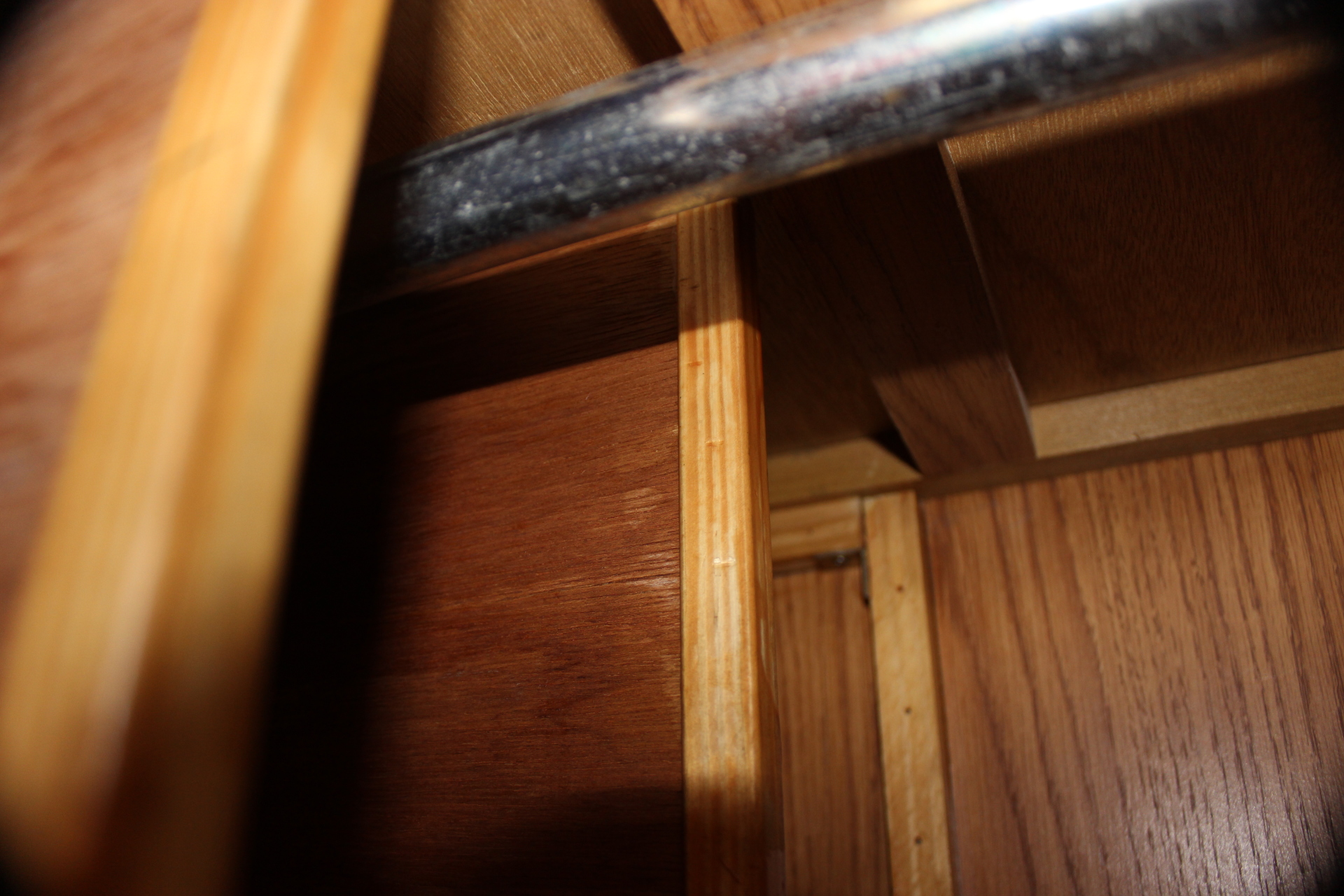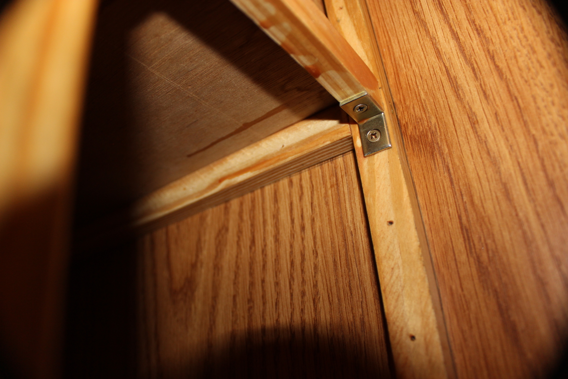 I had to cut a slot for the door latch in the front panel (image 2597) so the panel would lay flat against the front frame of the wardrobe and not bulge. I also used some angle brackets (one on each side of the partition… image 2595) in two different places to strengthen the partitions and keep them from wobbling.
