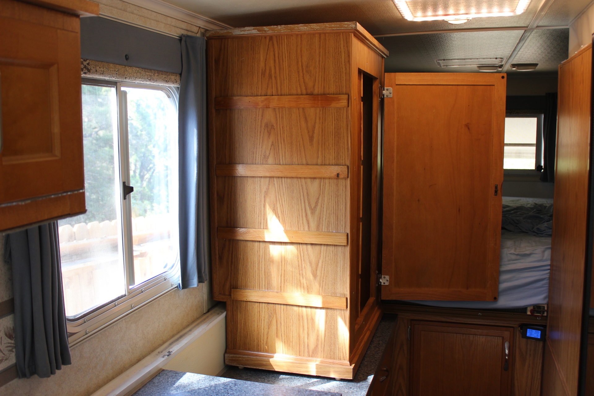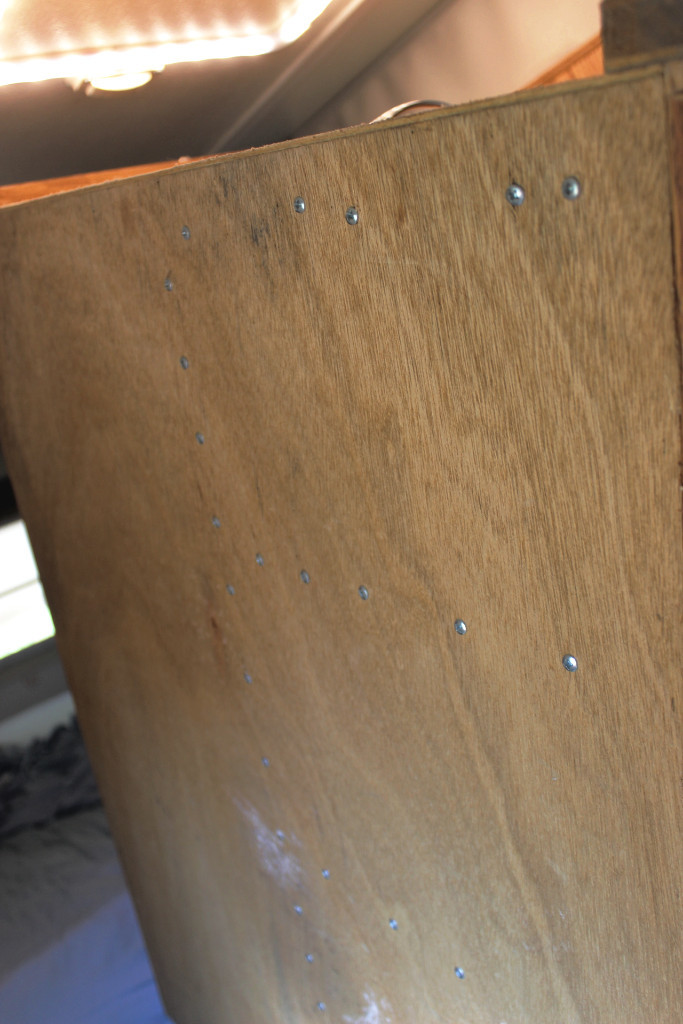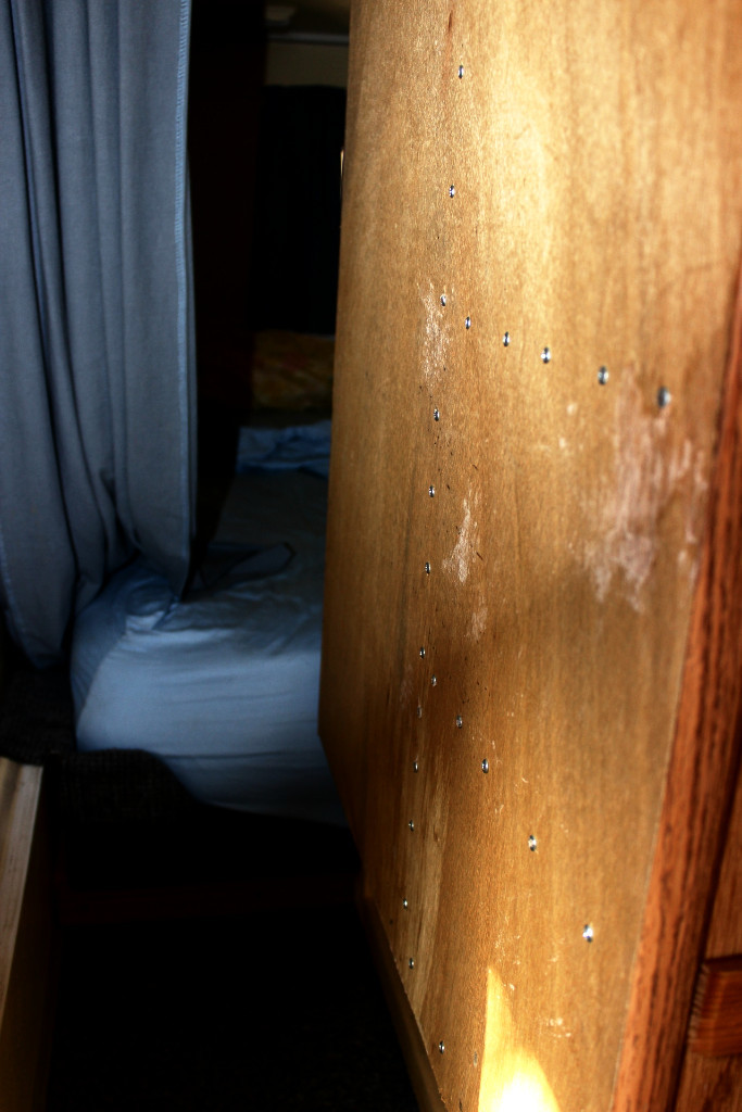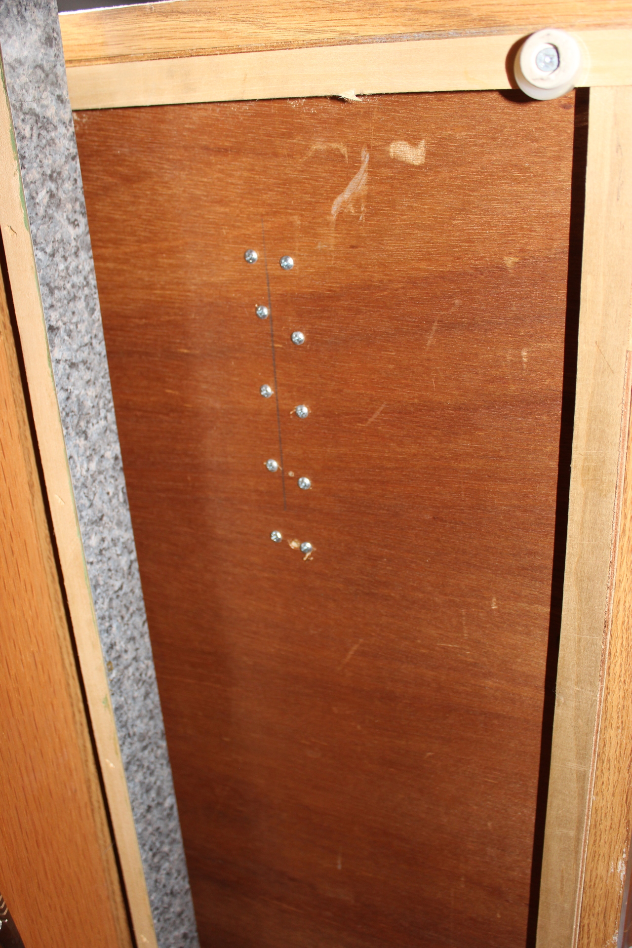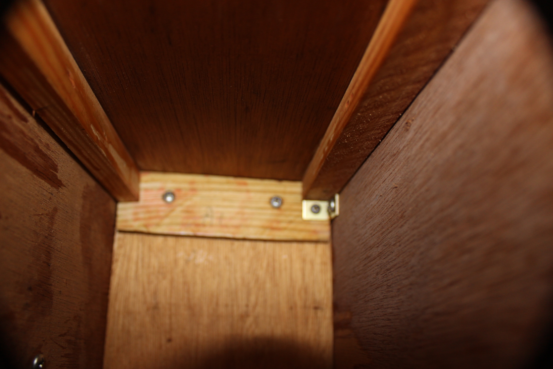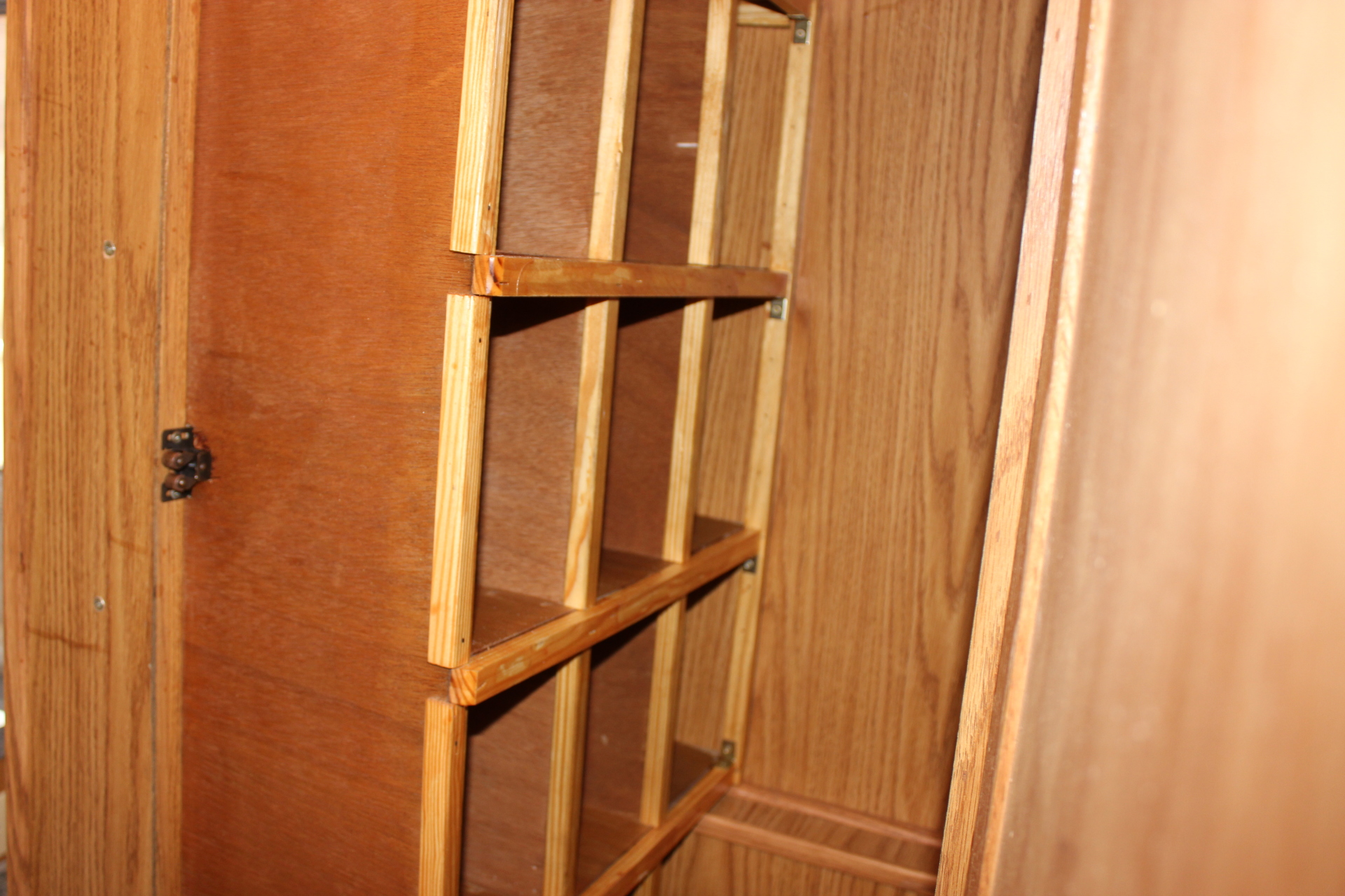 I had to cut a slot for the door latch in the front panel (image 2597) so the panel would lay flat against the front frame of the wardrobe and not bulge. I also used some angle brackets (one on each side of the partition… image 2595) in two different places to strengthen the partitions and keep them from wobbling.